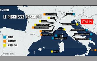 Nella foto, la mappa delle "ricchezze nascoste" dell'Italia: litio, grafite e cobalto. Concentrandoci sul litio, la fascia vulcanica pretirrenica che va dalla Toscana al Lazio, fino alla Campania, sarebbe ricca di questo elemento