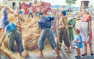 (ANSA) - GROSSETO, 01 GEN - È stato "rintracciato" a Grosseto grazie all'interessamento di un antiquario, e presto tornerà visibile a tutti, 'Il grano della bonifica lucchese', grande dipinto su tela (cm 233 x 300) che il pittore viareggino Alfredo Catarsini realizzò nel 1940 per partecipare alla seconda delle tre edizioni del Premio Cremona, tra le più importanti kermesse per giovani artisti italiani che si svolse tra il 1939 e il 1941 nella città lombarda. Nonostante le dimensioni notevoli e la fama che l'aveva accompagnata anche all'estero, dell'opera si erano perse le tracce una dozzina di anni fa; ma la grande campagna di ricerca di opere fuori circuito di Alfredo Catarsini per il loro inserimento nel catalogo generale in corso di realizzazione lanciata dalla Fondazione intitolata al pittore viareggino ha dato i suoi frutti. Infatti, dopo la 'scoperta' di un ritratto femminile nel Museo di Anagni (Roma), adesso viene reso noto che 'Il grano della bonifica lucchese', una delle opere più ambite di Catarsini, è stato ritrovato in Maremma presso l'antiquario grossetano Maurizio Ticci che lo aveva acquisito alla sua collezione dopo una mostra a Palazzo Mediceo di Seravezza (Lucca).