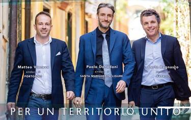 Campagna elettorale unica per i tre sindaci di Rapallo, Santa Margherita e Portofino, comuni guidati da tre quarantenni di centrodestra. Visti i buoni rapporti di vicinato, i sindaci uscenti hanno realizzato un manifesto che li riprende insieme. L'iniziativa coinvolge anche il primo cittadino di Portofino, anche se nel borgo dei vip non si voterà a maggio. "Continuiamo insieme - Per un territorio unito" è lo slogan della foto che riprende Matteo Viacava, Paolo Donadoni e Carlo Bagnasco, sindaci di Portofino, Santa Margherita e Rapallo. "La collaborazione nata negli ultimi anni tra i nostri comuni - recita una nota - non ha precedenti e rappresenta la vera novità politica del Golfo del Tigullio. Dopo decenni di conflittualità e campanilismi c'è una visione ampia". I sindaci ricordano i progetti portati avanti insieme: collegamenti per ospedali e aeroporto, il Discobus, il Red Carpet da Rapallo a Portofino, la festa per la riapertura della strada per Portofino distrutta dalla mareggiata del 29 ottobre.