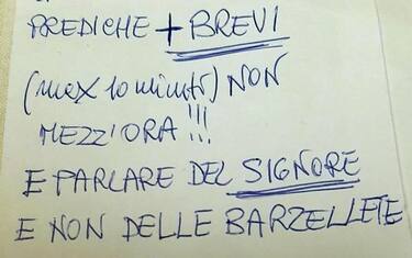 "Devi fare le prediche + brevi (max 10 minuti), non mezz'ora!!! E parlare del Signore, non delle barzellette. Capito?". E' questo il contenuto di un biglietto anonimo, recapitato il primo dell'anno (ma la notizia trapela solo ora) a Umberto Toffani, parroco di Santo Stefano al mare, in provincia di Imperia. "Sarà stato qualcuno che ha bevuto troppo, di ritorno dal veglione. L'ho trovato sul tappeto all'ingresso del mio studio, sul lungomare", racconta il sacerdote.
