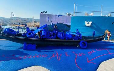 Questa la descrizione dell'opera: lLa via al Mare Fabrizio de André si trasforma in un luogo dello stupore, con la presenza di una gondola, carica di detriti raccolti nei fondali della laguna veneziana (grazie all'azione dei Gondolieri Sommozzatori Volontari di Venezia) e dipinti di blu Klein, affiancata da un grande schermo che la proietta nel metaverso. L'opera è adagiata su un tappeto di gomma riciclata a forma di goccia, sul quale è intarsiato un verso di Eugenio Montale. Vari elementi compongono l'installazione di Rotelli, che investe sulla bellezza estetica della gondola caricandola di significati e incaricandola di un viaggio nel mare aperto della vita per un messaggio poetico ed etico che fluisce anche nel metaverso. (ANSA).