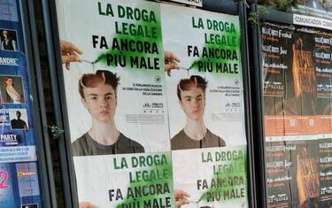 (ANSA) - RAPALLO, 20 LUG - "La droga legale fa ancora più male" è la scritta che si legge sui manifesti dell'associazione Pro Vita & Famiglia Onlus che rivolge un appello affinché "il Parlamento blocchi la legge sulla legalizzazione della cannabis". Nell'immagine si vede una mano che lascia cadere la cenere di uno spinello nella testa spaccata di un adolescente.