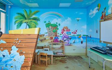 (ANSA) - GENOVA, 12 SET - Un mondo fantastico popolato da creature marine per viaggiare con la fantasia anche in ambito ospedaliero. Ecco "L'isola del Tesoro" la nuova installazione artistica di Silvio Irilli, artista e fondatore di Ospedali Dipinti, che ha trasformato la sala giochi del reparto di emato-oncologia dell'ospedale Gaslini. Una iniziativa promossa da una nota casa di dermocosmesi che ha devoluto all'istituto Gaslini 25 mila euro dopo aver lanciato inizialmente un concorso che ha visto gli stessi bambini protagonisti. I piccoli hanno disegnato figure di personaggi marini esposti nelle farmacie e tra questi è stato scelto quello di una bambina raffigurante una dolcissima foca marina. L'opera è stata poi riprodotta dall'artista Irilli sulle pareti della stanza scelta trasformandola in un ambiente amico per i piccoli pazienti.