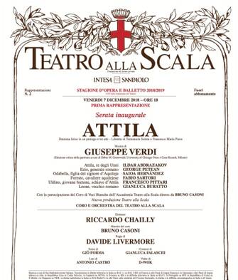 Nella foto, la locandina dell'opera per la serata inaugurale della Scala. L’opera, divisa in un prologo e tre atti, mette in scena le vicende dei tre protagonisti: Attila, re degli Unni, Ezio, generale romano, e Odabella, figlia del signore di Aquileia -