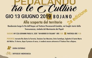 (ANSA) - BOJANO (CAMPOBASSO), 11 GIU - Appuntamento in bici a Bojano, giovedì 13 giugno, alle 8.30 in piazza Giovanni Paolo II, per la 2/a edizione di 'Pedalando tra le Culture', una randonnée lungo le Vie dell'Acqua sul Tratturo Pescasseroli-Candela nei luoghi storici della Transumanza, con percorso di difficoltà medio-bassa che prevede di costeggiare il torrente Rio dietro la linea ferroviaria, stazione S.Massimo, bivio Cantalupo, laghetto di Santa Maria del Molise (Isernia), con sosta per il pranzo al sacco. Qui il sindaco Costantino Kniahynicki, con una rappresentanza comunale, accoglierà i ciclisti e consegnerà loro una pergamena di benvenuto. Il ritorno si snoderà attraverso il Tratturo fino a Bojano. Nei punti di sosta, una guida illustrerà i caratteri salienti delle località attraversate, da un punto di vista storico, socio-culturale e antropologico; una guida ambientale descriverà le caratteristiche naturalistiche e paesaggistiche.