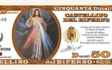 (ANSA) - CASTELLINO DEL BIFERNO (CAMPOBASSO), 20 APR - Contro la crisi economica da coronavirus e il disagio delle famiglie meno abbienti del paese, conia una moneta comunale: il ducato, riecheggiando Re Ferdinando II di Napoli ed è pronto a varare il "Borbone bond". Il progetto è del sindaco di Castellino del Biferno Enrico Fratangelo che ha distribuito nella piccola comunità molisana, 500 abitanti, le banconote plastificate: 20 e 50 ducati, con numeri progressivi raffiguranti immagini religiose con lo stemma del paese. In una c'è anche l'immagine dello stesso Fratangelo. La moneta castellinese è stata adottata con decreto pubblicato lo scorso 17 aprile e fa seguito al regolamento comunale approvato nel 2018 il cui contenuto cita il regio decreto del 1831 del re di Napoli Ferdinando II. Il valore del ducato è uguale all'euro ed è consegnato alle famiglie meno abbienti di Castellino del Biferno che le utilizzano per la spesa alimentare nei negozi. Gli esercenti riconsegnano le banconote e ottengono il denaro corrispondente.