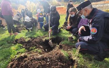 (ANSA) - CASTEL DI SANGRO, 27 OTT - I Carabinieri del Reparto Biodiversità di Castel di Sangro (L'Aquila) hanno piantato altri due nuclei di "bosco diffuso" insieme ai bambini delle Scuole Primarie di Alfedena e di Paterno, frazione di Avezzano. Questi boschetti, insieme ad altre centinaia piantati in Italia nel progetto "Un albero per il futuro" (https://unalberoperilfuturo.rgpbio.it/) costituiscono un'imponente massa di alberi, oltre 5.000, in grado di immagazzinare oltre 80 tonnellate di anidride carbonica ogni anno. I bambini hanno partecipato alla messa a dimora di alberelli di faggio, roverella, cerro orniello, acero, sorbo e corniolo. Hanno partecipato anche i volontari in servizio presso il Reparto Carabinieri Biodiversità, 11 ragazzi tra i 20 e i 25 anni che partecipano al progetto LIFE ESC360 (monitoraggio della biodiversità nelle Riserve Statali comprese nelle aree della Rete Natura 2000 dell'Ue), coinvolgendo gli alunni in giochi di riconoscimento delle principali specie tutelate a livello europeo presenti nelle Riserve Naturali Statali gestite dai Carabinieri.