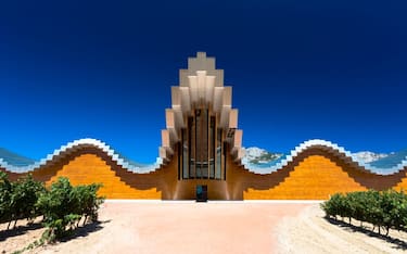 Svetta tra i vigneti della storica cantina Marqués de Riscal, l’azienda vinicola più antica di Spagna, la tenuta di Elciego, nella Rioja iberica. Inconfondibile la firma dell’architetto Frank O. Gehry. Una vera e propria città del vino. Un luogo di incontro e di studio, un albergo e un ristorante. Esternamente la struttura presenta cascate di titanio di diversi colori che con la luce riflette le tonalità tipiche delle bottiglie di vino rosso Marqués de Riscal (Foto Marqués de Riscal)