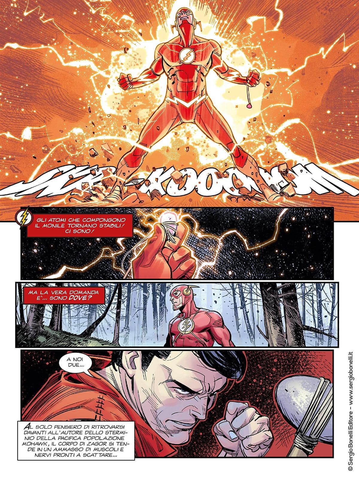 MU: Ci siamo imposti una regola: niente scorciatoie, non doveva essere un Elseworld, una realtà alternativa in cui per esempio Flash fosse nato nel Far West. Doveva essere una storia di Flash e una storia di Zagor e dovevamo trovare all’interno delle due serie tutti gli elementi che potevano portare a questo incontro. Io ho recuperato tutte le storie di Flash dall’86 in poi, dopo Crisi sulle Terre Infinite. Giovanni tutte quelle di Zagor che ancora non aveva letto. I primi mesi li abbiamo passati così, a studiare segnando tutto ciò che ci sembrava buono per trovare i punti in comune.