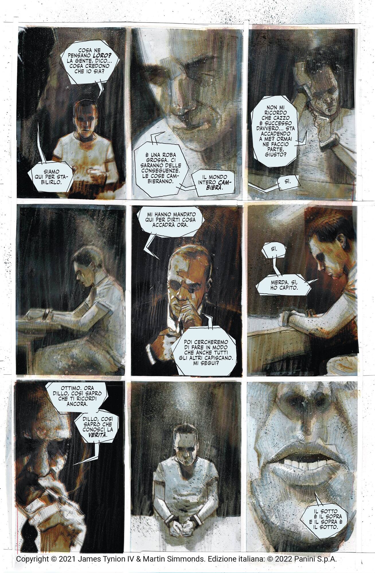 Naturalmente una serie a fumetti di successo non può prescindere da un comparto grafico di primissimo piano, fornito qui da Martin Simmonds (Dying is Easy, Punks Not Dead) che regala tavole di rarissima bellezza. Simmonds utilizza uno stile pittorico graffiato, che a tratti ricorda il McKean di Arkham Asylum, altrettanto capace di trasmettere al lettore un’atmosfera di angoscia paranoide corroborata ulteriormente dai toni cupi di una colorazione che pesca in una tinozza volutamente limitata, tra il grigio, il seppia, il blu, il rosso e il giallo, comunicando una sensazione di sporcizia più spirituale che fisica. Il tutto risulta perfettamente funzionale al racconto contribuendo a rendere The Department of Truth ciò che è: una delle serie a fumetti più interessanti dell’anno.