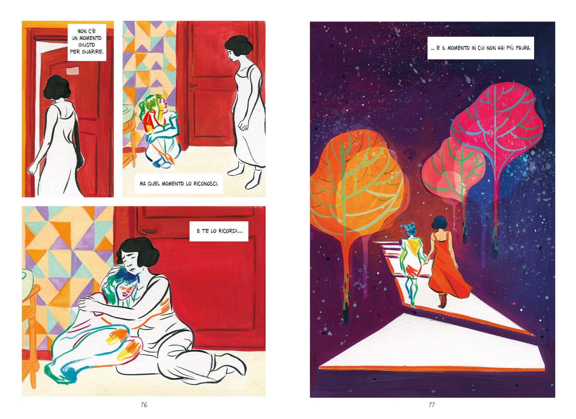 A volte ci sono situazioni in cui il processo di guarigione dal trauma non è lineare, non si compie in una volta sola, può essere lungo. E anche il proprio ruolo dentro l’esperienza traumatica non è mai un ruolo univoco e stereotipato, non tutte si comportano allo stesso modo. La scissione che provoca uno stallo interno è difficile da risolvere, volevo rappresentare la complessità dell’essere vittima.