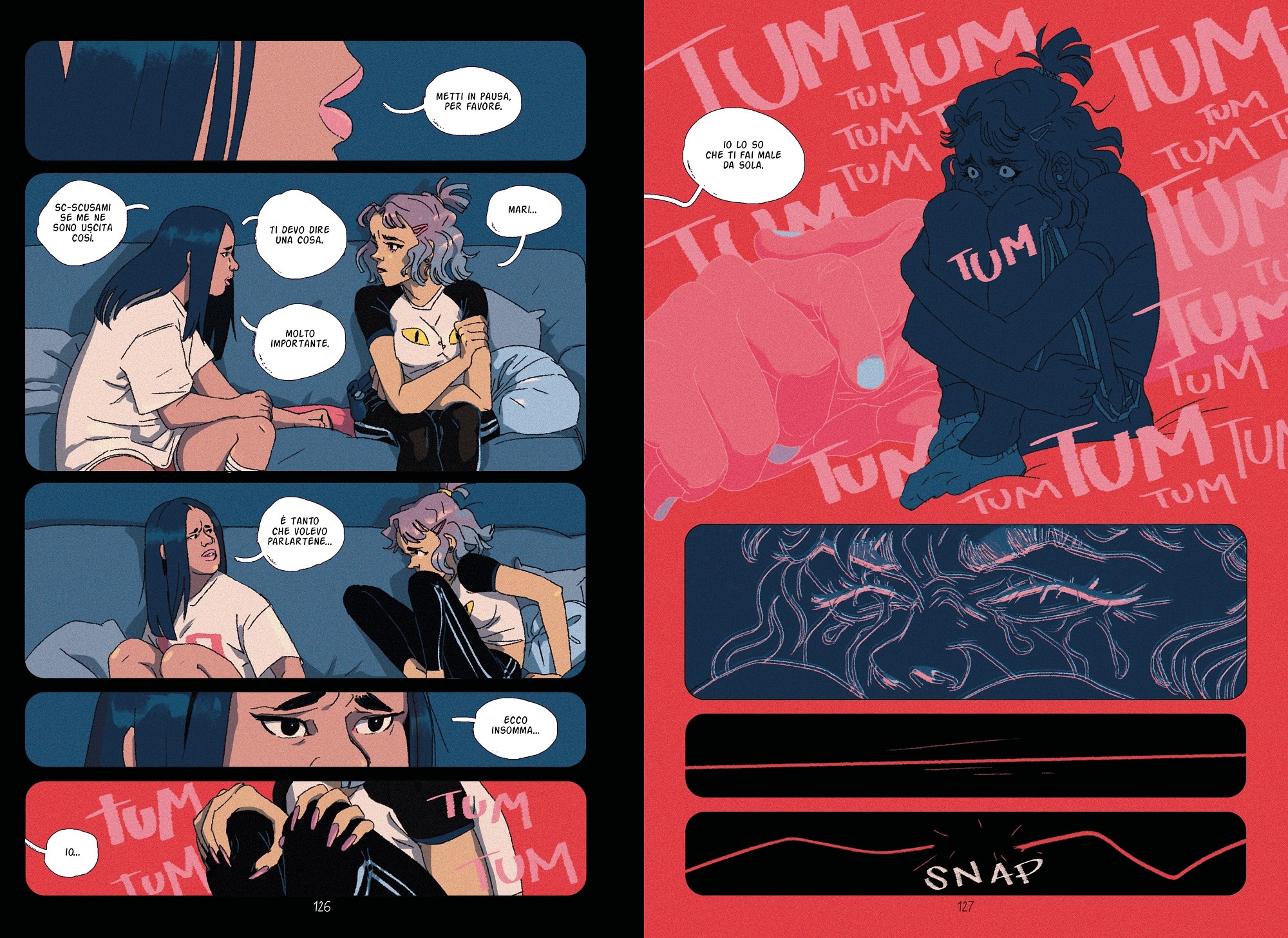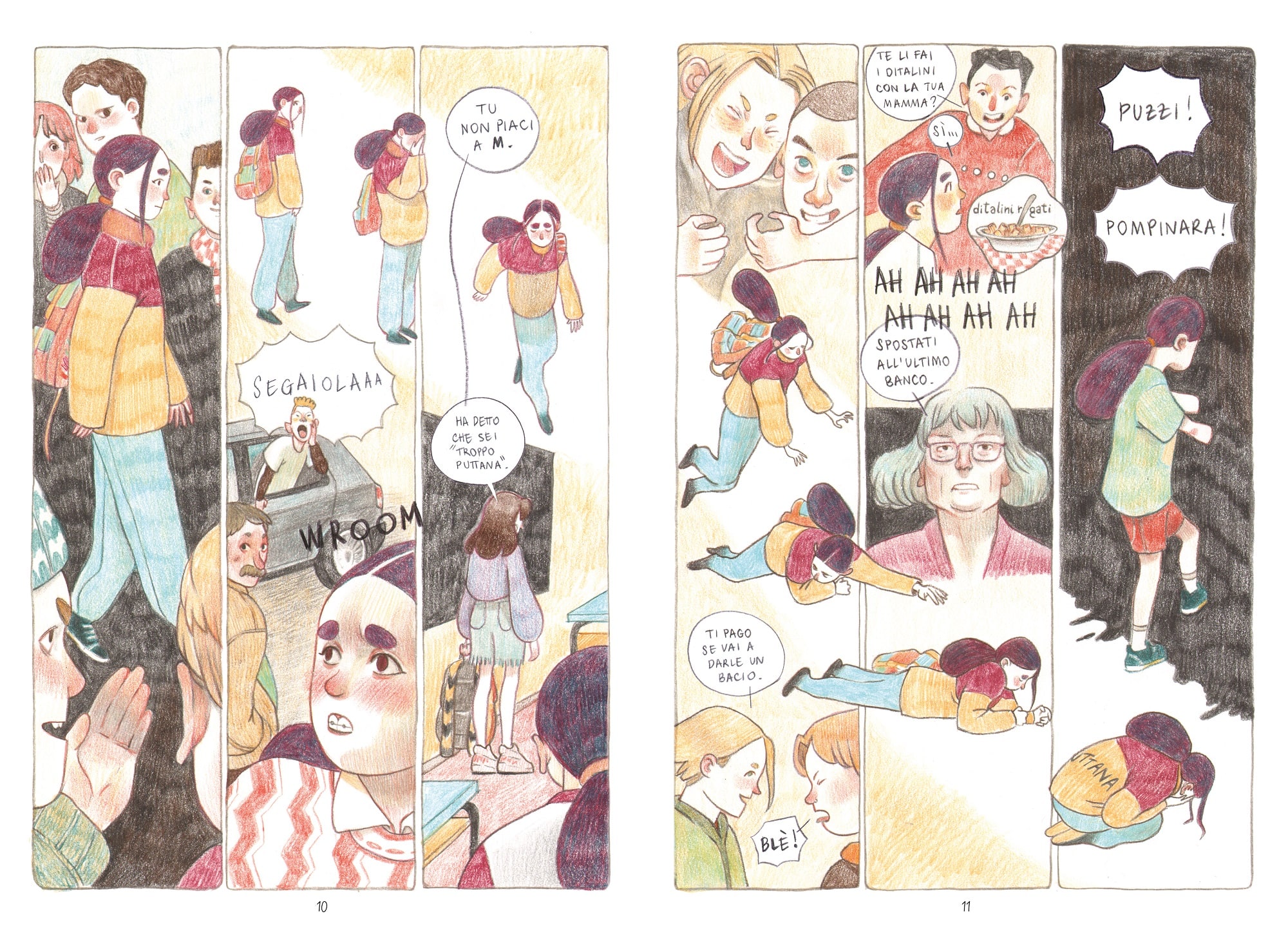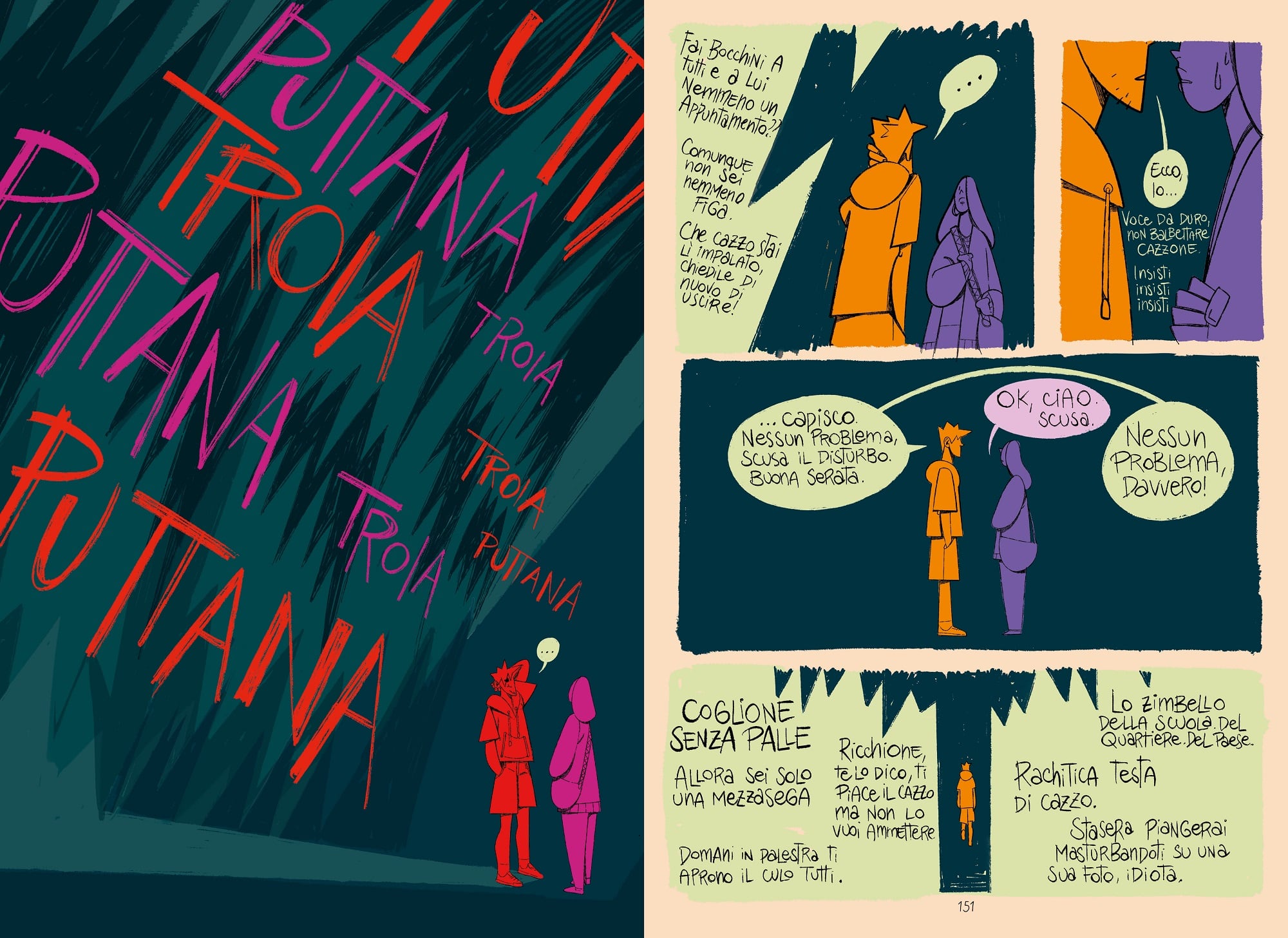 Questa è una storia che abbiamo voluto fortemente, sia la casa editrice e poi noi. Davide Costa ha mostrato molto bene la pressione che subisce un ragazzo o un uomo nel doversi adeguare a un modello di maschio alfa e che lo porta poi a dei comportamenti che possono non essere suoi. È anche la storia che ha il linguaggio più esplicito, forte e diretto, perché avevamo bisogno di far capire la violenza di quelle parole. La mascolinità tossica danneggia anche gli uomini, in modo diverso, ma non è detto che ogni uomo si trovi a suo agio in questo modello patriarcale. In un’altra storia, quella di Lucia Biagi, ad ascoltare la vittima è il suo amico, non la madre o la sorella. Il nostro non vuole essere un messaggio di divisione e conflitto a prescindere.