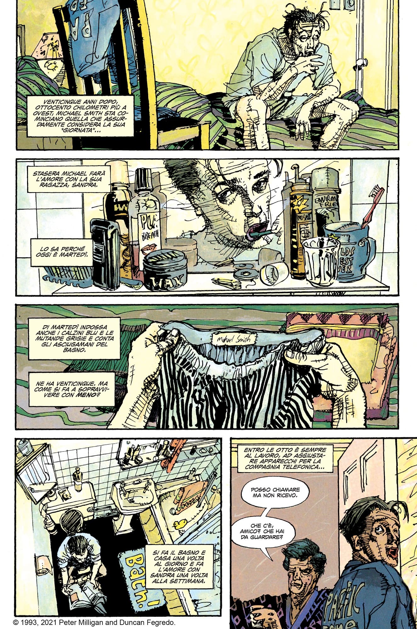 Michael Smith è un uomo ordinario, un abitudinario che ogni giorno segue la sua routine prestabilita, vive in una rassicurante mediocrità, e fa l’amore con la sua compagna ogni martedì sera. Il tipo di personaggio più lontano possibile dall’idea di avventura a fumetti, eppure è il protagonista di Enigma, fumetto capolavoro firmata da Peter Milligan e Duncan Fegredo, pubblicata nel 1993 dall’etichetta Vertigo della DC Comics e ora riproposta da Dark Horse negli Stati Uniti e da Panini Comics in Italia, con un’edizione cartonata definitiva ricca di contenuti extra (256 pagine, 26 euro).