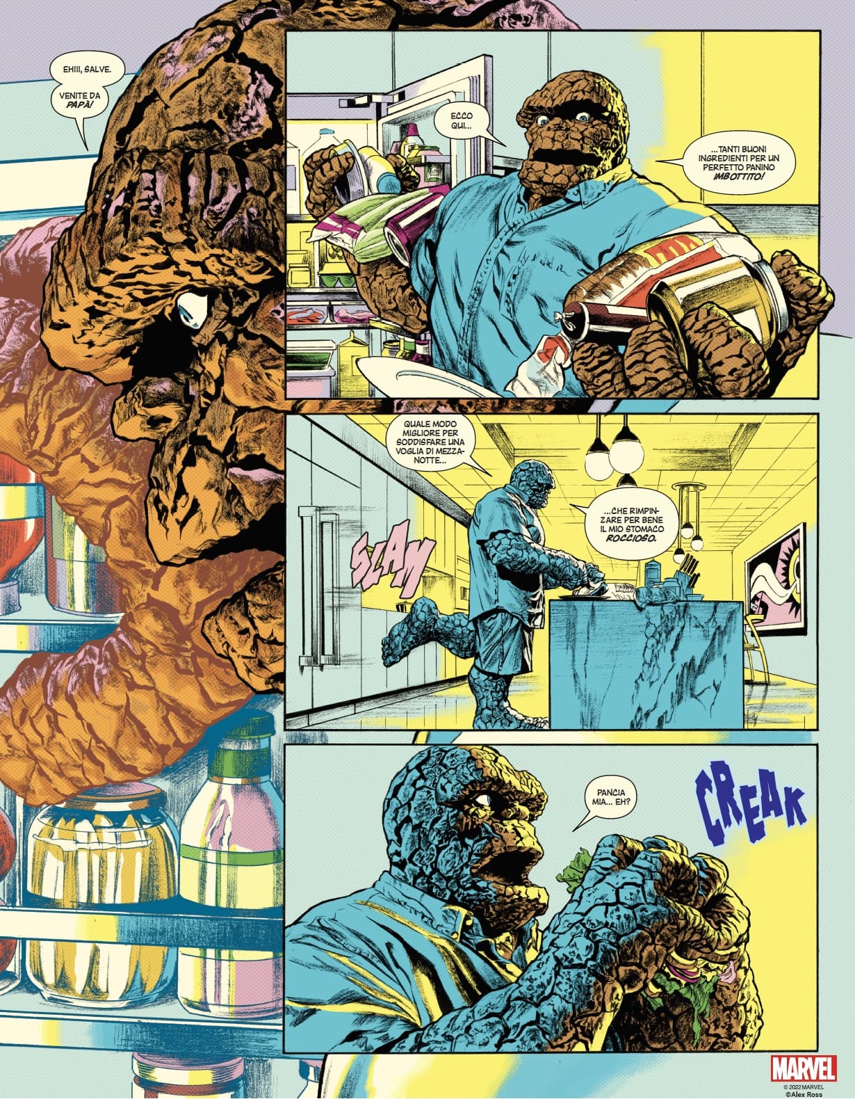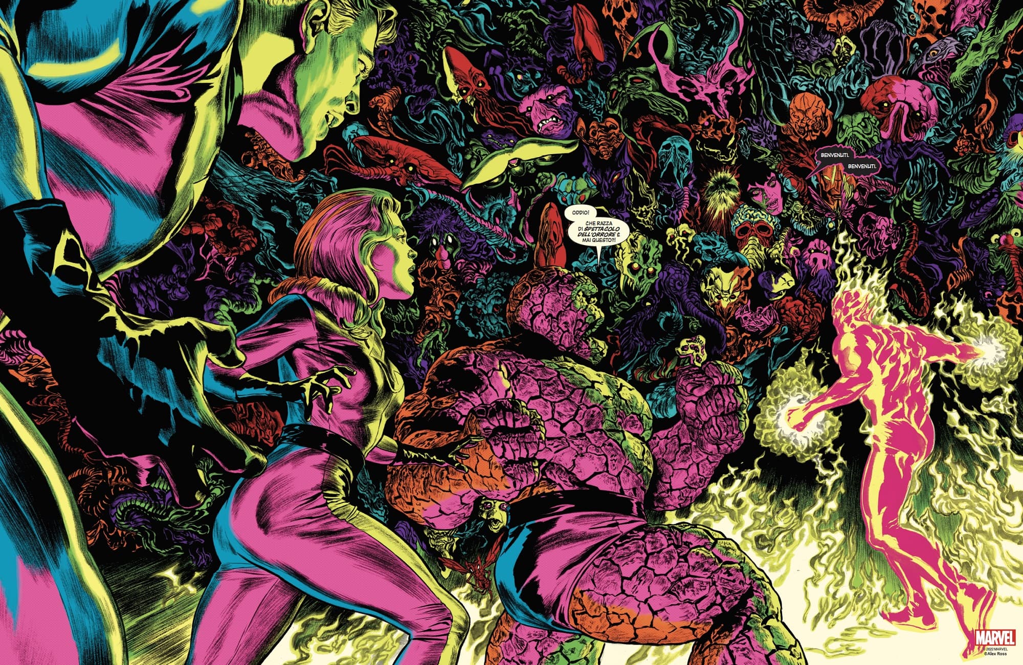 Anche nella sceneggiatura Ross sperimenta un approccio in equilibrio tra tradizione e innovazione, omaggia due giganti come Lee e Kirby, mostra grandissimo rispetto per la storia della testata, ma aggiunge nuovi spunti di riflessione interessanti, affidati alle elucubrazioni di Reed Richards che nelle pagine finali stila una nuova teoria decisamente intrigante sull’essenza della Zona negativa e di ciò che la abita. Non mancano momenti di leggerezza affidati alla pungente ironia della Cosa, che fa da contraltare invece alla depressione esistenziale dello stesso personaggio con cui si apriva “This Man… This Monster”.