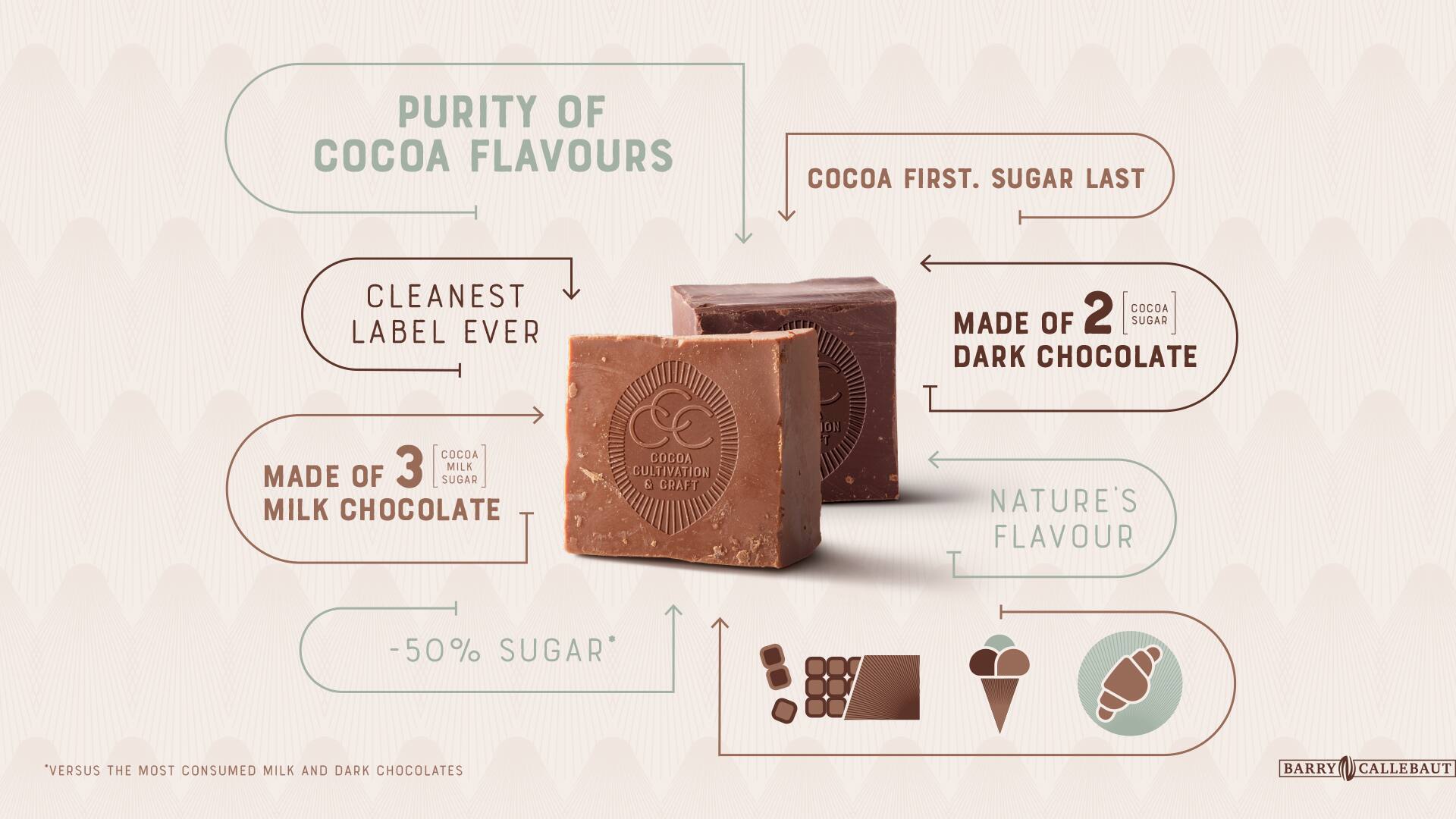 Applicando il principio CCC, Barry Callebaut ha potuto ridefinire completamente il cioccolato mettendo “ il cacao al primo posto, lo zucchero all’ultimo”. E proprio per sperimentare ogni sfumatura di sapore del cacao, la ricetta della seconda generazione di cioccolato è la più pura possibile e contiene il 60-80% in più di cacao. Il cioccolato fondente è composto da due ingredienti: il cacao al quale viene aggiunto solo zucchero. Il cioccolato al latte è invece composto da cacao, latte e zucchero. La seconda generazione di cioccolato contiene il 50% di zucchero in meno rispetto a più dell ‘80% del cioccolato consumato nel mondo.