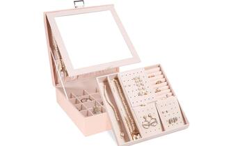 Cosa meglio di un mega cofanetto organizzato per custodire orecchini, collane, braccialetti e anelli per le appassionate di gioielli? Questo portagioie del brand Tikea, venduto da Amazon, ha gli interni in velluto ed è disponibile in rosa e in nero. Prezzo: € 32,99