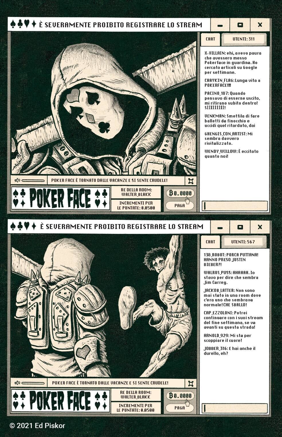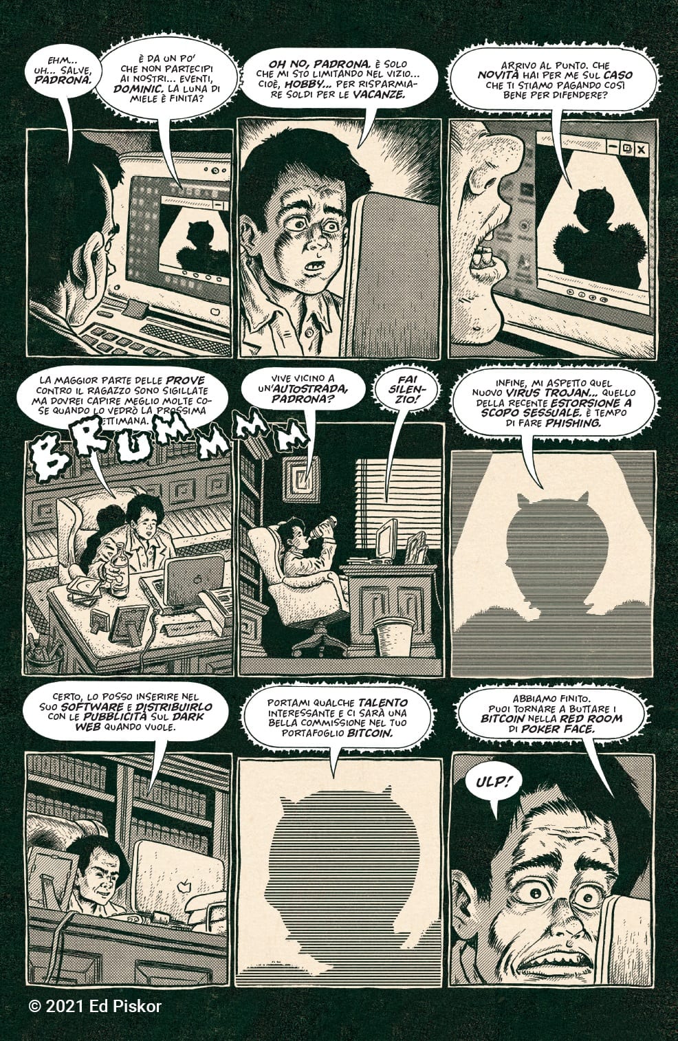 Ma mentre mette in scena le torture peggiori, Piskor non dimentica l’aspetto più umano della trama, raccontandoci dettagli della vita quotidiana delle star delle Red Room e delle vittime, quando queste riescono a uscire dall’anonimato in cui normalmente vengono segregate. Red Room è inquietante perché, sebbene non abbia poi grandi intenti allegorici, ritrae una società possibile e costruisce un mondo che affonda le radici nel nostro, pescando a piene mani dalla storia dello snuff movie e dalle cronache del dark web. È inquietante perché ci mette davanti a dei mostri che non sono solo i crudeli serial killer star delle Red Rooms, ma anche, e forse soprattutto, i clienti in giacca e cravatta che coperti da anonimato alimentano il business sadico.
