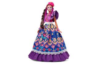Calendula cempasúchil e fascia rosa con nastri svolazzanti per la Barbie che rende omaggio al Dia De Muertos. Prodotta nel 2022, onora una tradizione antica e molto sentita. Indossa un abito viola intenso, con scheletri decorativi, teschi e dettagli floreali. I capelli sono raccolti per mettere in risalto il disegno della calavera dipinto sul volto. Euro 75,99