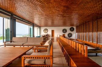 A caratterizzare gli interni della villa a Melissa sono ampi spazi con enormi finestre. Tutti i mobili sono stati realizzati da artigiani locali. Il salone è composto da diversi divani e sedute organizzati per offrira la migliore delle viste possibili sulla baia e sulle distese verdi che circondano l'abitazione