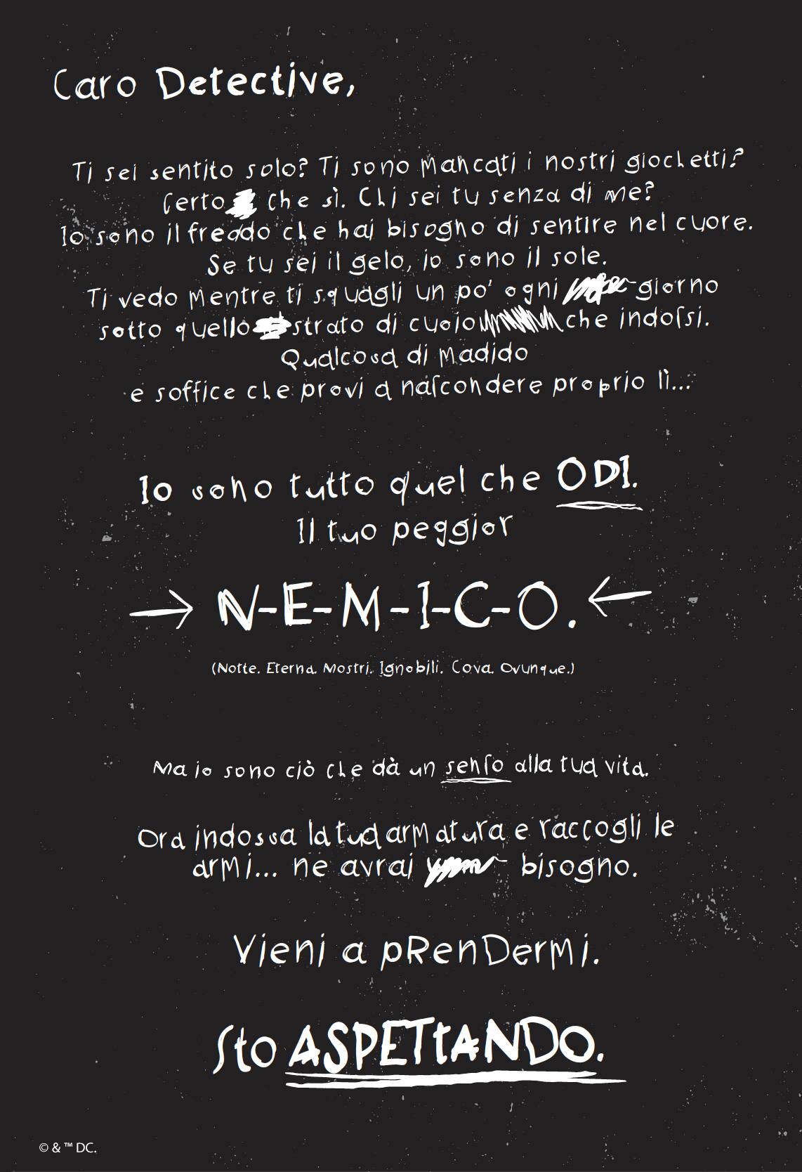 Batman: Caro Detective (Panini Comics, 64 pagine a colori di grande formato, 25 euro) è qualcosa di completamente diverso. Non è un fumetto e non è un romanzo illustrato. Non è nemmeno strettamente un art book, per quanto forse sia la definizione a cui si avvicina maggiormente. È un omaggio di Bermejo a Batman e di Batman a Bermejo, una raccolta delle sue cover più belle unite tra di loro dal filo tessuto da una particolarissima lettera d’amore, scritta nello stile che potrebbe essere dell’Enigmista e dal mittente occulto fino alla fine.