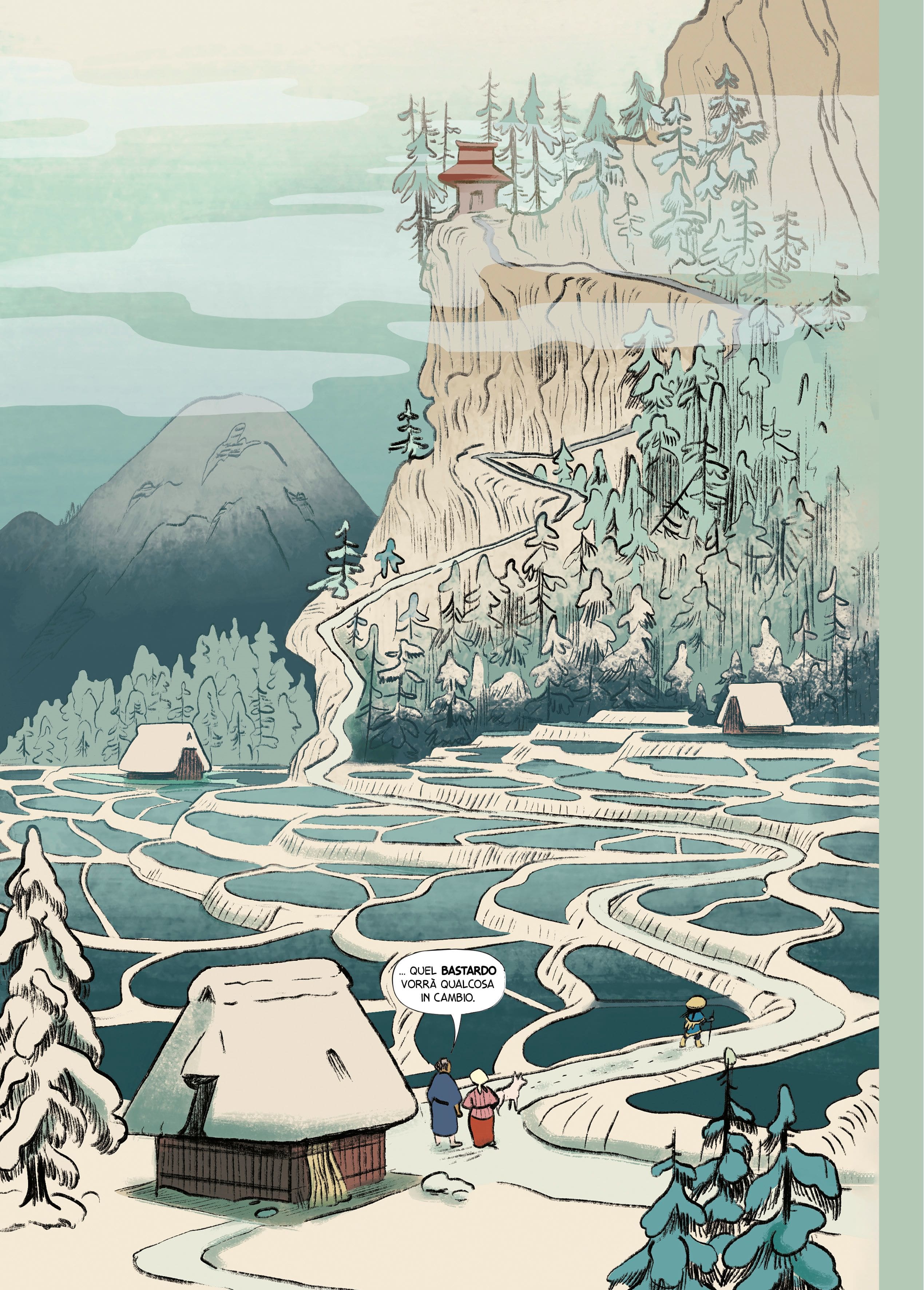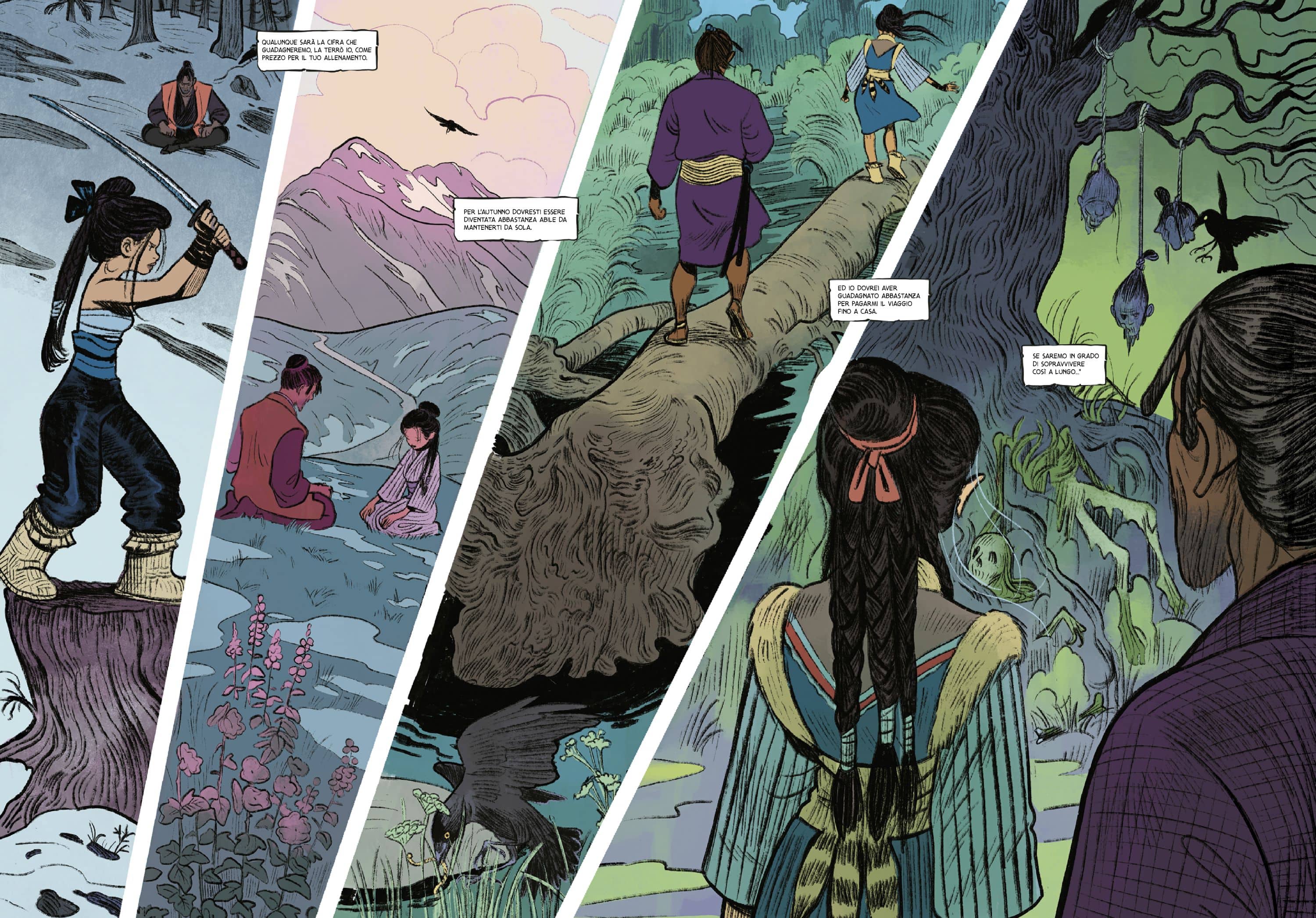 Le tavole di Isabella Mazzanti rubano gli occhi per la loro bellezza. Il tratto morbido che richiama la scuola del fumetto franco-belga si lascia ibridare da sfondi e sequenze oniriche che rendono omaggio all’arte giapponese, schivando sempre i facili richiami allo stile manga contemporaneo. La costruzione delle tavole vede l’utilizzo frequente di vignette orizzontali sequenziali in grado di comunicare un’azione quasi cinematografica, sebbene non manchino tavole con layout più dinamici e irregolari. I colori tenui ed eleganti di Valentina Napolitano, che firma anche la splendida copertina, completano un comparto artistico semplicemente straordinario, autentico punto di forza dell’opera, ulteriormente valorizzato da un’edizione di elevata qualità cartotecnica e dalla dimensione delle tavole (17x24).