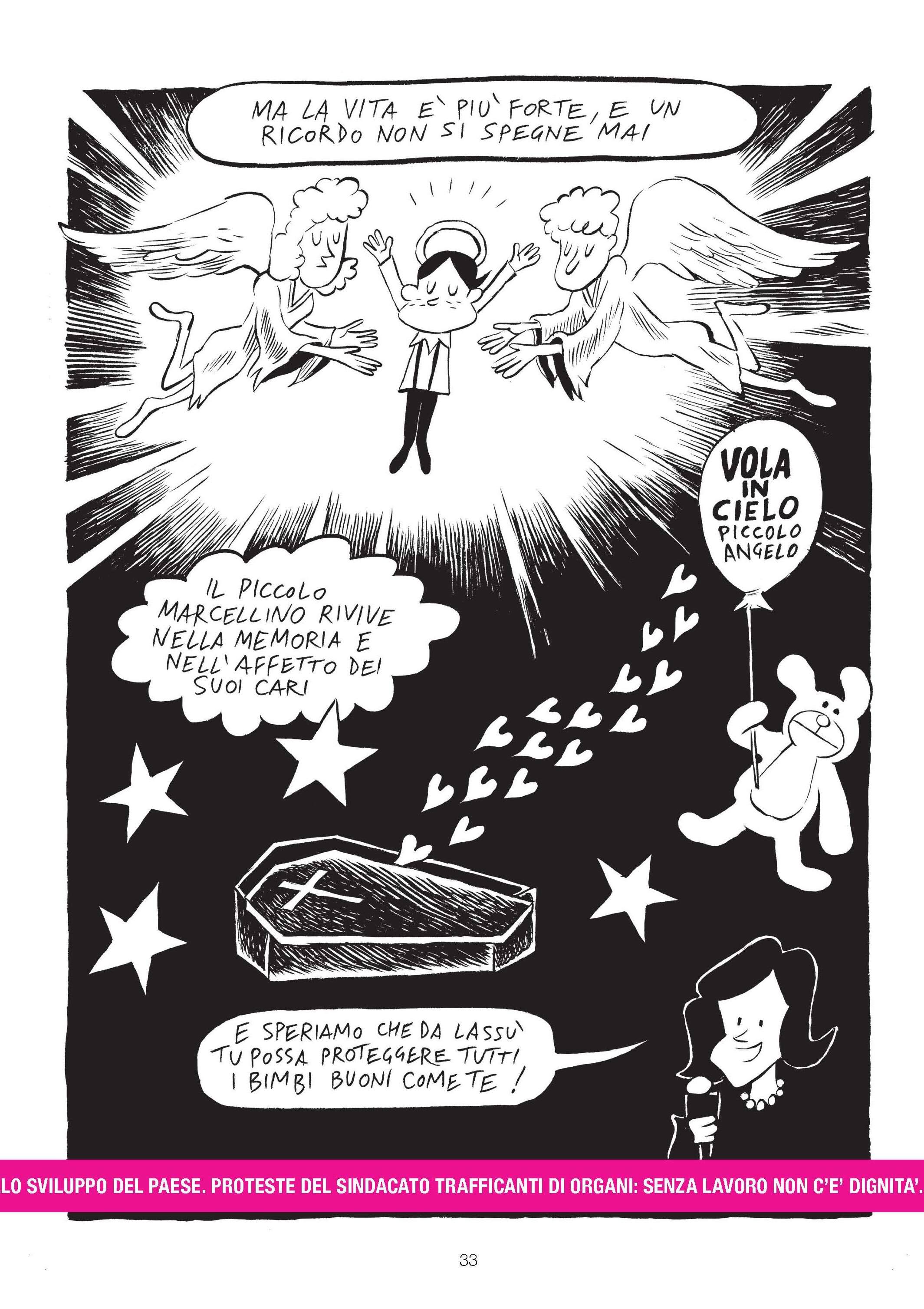 Corpicino è tutto questo senza perdere mai di vista la storia e i suoi personaggi, dal piccolo Marcellino Diotisalvi, ucciso nella orrorifica e opprimente sequenza d’apertura, al giornalista Martinelli, che pur sforzandosi di dare un senso di pubblica utilità al suo lavoro, onorando la professione, finisce dentro il tritacarne mediatico che rischia di inghiottirlo e sputarlo a pezzi, passando per il professor Giraldi, barlume di lucidità in un mondo che pare aver perso del tutto la testa.