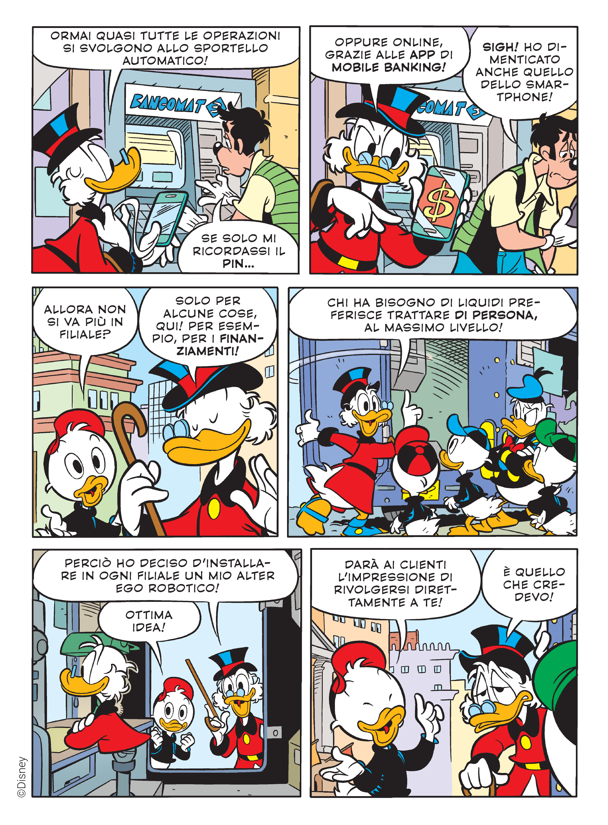 Il ruolo dei nipotini è ottimo per introdurre le nuove ‘diavolerie’ elettroniche e digitali, quello di Paperino perfettamente funzionale per avere sempre qualcuno pronto a chiedere che sta succedendo e poter così spiegare. L’essenziale ma non proprio tutto tutto, come giusto che sia: la curiosità di saperne di più (prendendo esempio da Paperone, tanto tradizionalista su molte cose quanto aperto e moderno se si stratta di aumentare i guadagni) dovrebbe essere la molla che spinge il lettore – qui siamo su una fascia non di bambini ma quantomeno adolescenziale, oltre che per ‘adulti a digiuno’ – a scoprire nuovi mondi non supereroistici ma sempre più somiglianti a quello che vivremo un domani e dobbiamo conoscere già oggi.