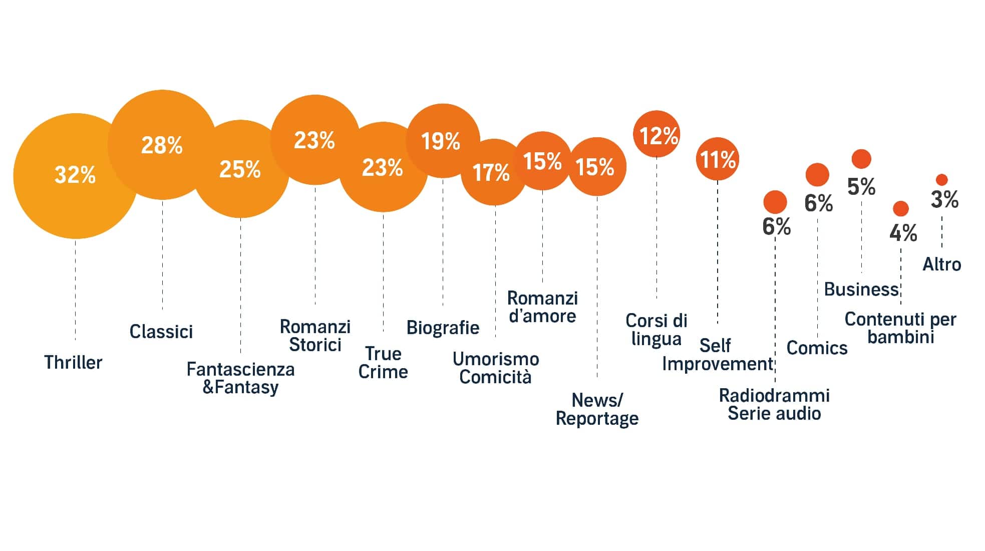 Il lockdown dovuto alla pandemia da Covid-19 ha contribuito ad aumentare la fruizione di contenuti digitali come gli audiolibri; alla fine dell’emergenza però il trend non si è interrotto, anzi, ha continuato a crescere. Nel 2024 infatti la media di ascolto è salita a due volte al mese: il 31% degli intervistati ascolta almeno una volta a settimana, il 5% tutti i giorni o quasi. E le prospettive per il prossimo anno non sono da meno. “Abbiamo visto negli ultimi quattro anni che la crescita non è meno del 4-5% e anche per il prossimo anno non mi aspetto niente di meno”, ha detto a Sky TG24 il Country Manager di Italia e Spagna Juan Baixeras. “Temevamo dopo la fine della pandemia un crollo negli ascolti, perché le persone hanno riavuto la loro libertà e potevano fare altro. Invece non è stato così perché ormai gli audiolibri sono entrati nella normalità. Importante è rendere il catalogo sempre più attrattivo: quest’anno aggiungiamo titoli come Il Signore degli Anelli e altri evergreen come Ken Follet, Games of Thrones, Stephen King e Dan Brown”. Thriller, Classici e Fantasy restano al vertice ma da 8 anni, periodo di attività di Audible in Italia, l’azienda si impegna a fornire un catalogo sempre aggiornato e completo. Per questo, nel 2023 l'azienda ha investito 5,5 milioni di euro nella creazione e nella concessione di licenze di contenuti in lingua italiana.
