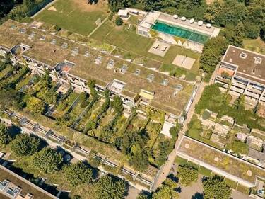 Ci spostiamo ad Halen, nei pressi di Berna, per visitare l'insediamento di case a schiera costruito tra il 1959 e il 1961 da cinque giovani architetti. I progettisti si ispirarono a Le Corbusier e al centro storico di Berna, caratterizzato da file di case e lunghi porticati. Le 79 unità residenziali a tre piani sono disposte su cinque file, tre al di sopra e due al di sotto della via principale e della piazza. Tutte le case sono oggi di proprietà privata e ospitano circa 220 persone. Nel corso degli anni la vegetazione è cresciuta intrecciandosi con l’insediamento, tanto che ora l’erba selvatica sui tetti, i giardini e i biotopi creano un singolare contrasto con il rigido reticolato dei muri in calcestruzzo.