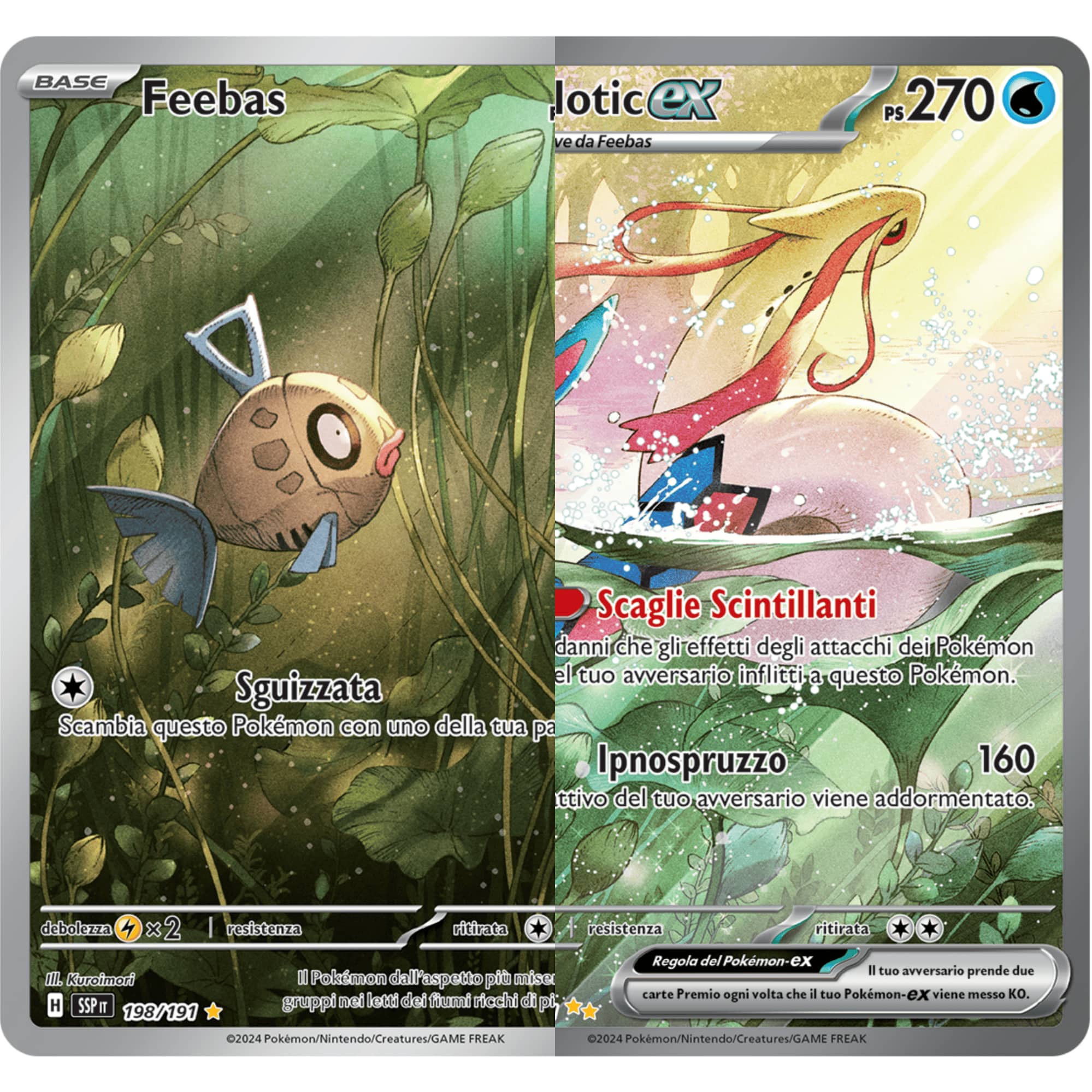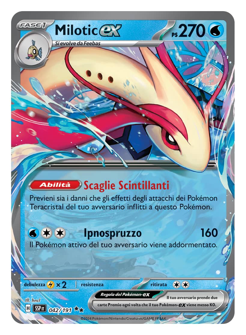 Per l’uscita della nuova espansione, in arrivo l’8 novembre, TPCi ha infatti rivelato a SkyTG24 una selezione in esclusiva di quattro carte che raffigurano la linea evolutiva di Feebas e Milotic, Pokémon introdotti nei giochi di terza generazione (Rubino e Zaffiro) e, almeno Milotic, fra i più amati dai fan. Ogni carta ha la sua rarità: parliamo di una comune, una double rare EX, una illustration rare e una special illustration rare EX.