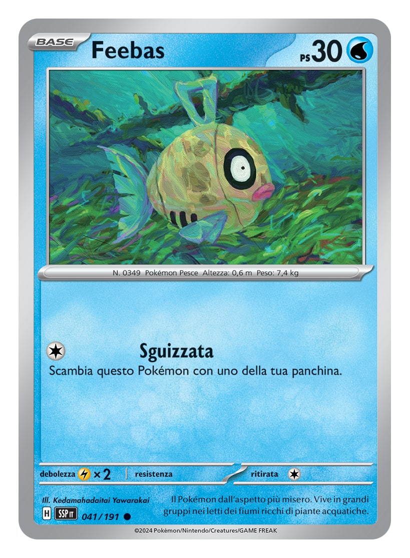 Ammettiamolo, quello di Feebas non è certo uno dei design più riusciti della saga, ma la scelta è voluta: come il brutto anatroccolo che si trasforma in cigno, anche lui è volutamente “brutto” e contrapposto alla sua evoluzione, Milotic, riconosciuto invece per la sua bellezza e la sua grazia. Il Feebas in questione, anche se comune, è apprezzabile per il suo valore artistico: è stato disegnato dall’illustratore Kedamahadaitai Yawarakai, già autore di altre sei carte del gioco di carte collezionabili e famoso per il suo stile sfumato, i disegni fatti solo a brush (in digitale, ma utilizzando solo pennelli) e le atmosfere tranquille. Tutte le sue carte, così come le altre opere di Kedamahadaitai, mostrano chiare ispirazioni alla corrente dell’impressionismo.