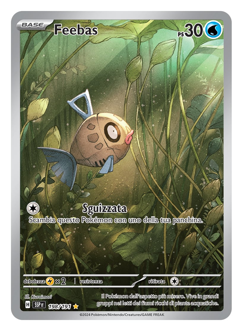 Dalla mano di Kuroimori, questa carta in particolare è una illustration, significa che il disegno copre l’intera carta senza bordi o cornici. Presenta un’olografia a specchio e raffigura un Feebas immerso nelle acque di un lago o di un fiume, in una fitta vegetazione marina fatta di piante dal fusto allungato e sottile. Il Pokémon pesce ha lo sguardo rivolto verso l’alto, dove alcuni brillanti raggi di luce tagliano l’oscurità degli abissi marini. Quei raggi, in realtà, provengono dal Milotic raffigurato nell’ultima carta rivelata da TPCi. Siamo infatti davanti a un esempio di combined illustration: due carte che, idealmente, vanno guardate insieme, perché l’una è collegata all’altra.