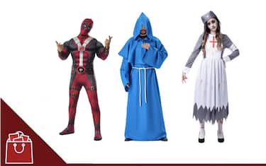 - Costume da monaco in poliestere, ideale per Halloween. Il set comprende un costume con cappuccio removibile, abbastanza grande da coprire il viso, oltre a una cintura di corda e a una collana con croce. Disponibile su Amazon al prezzo di 22,52 euro