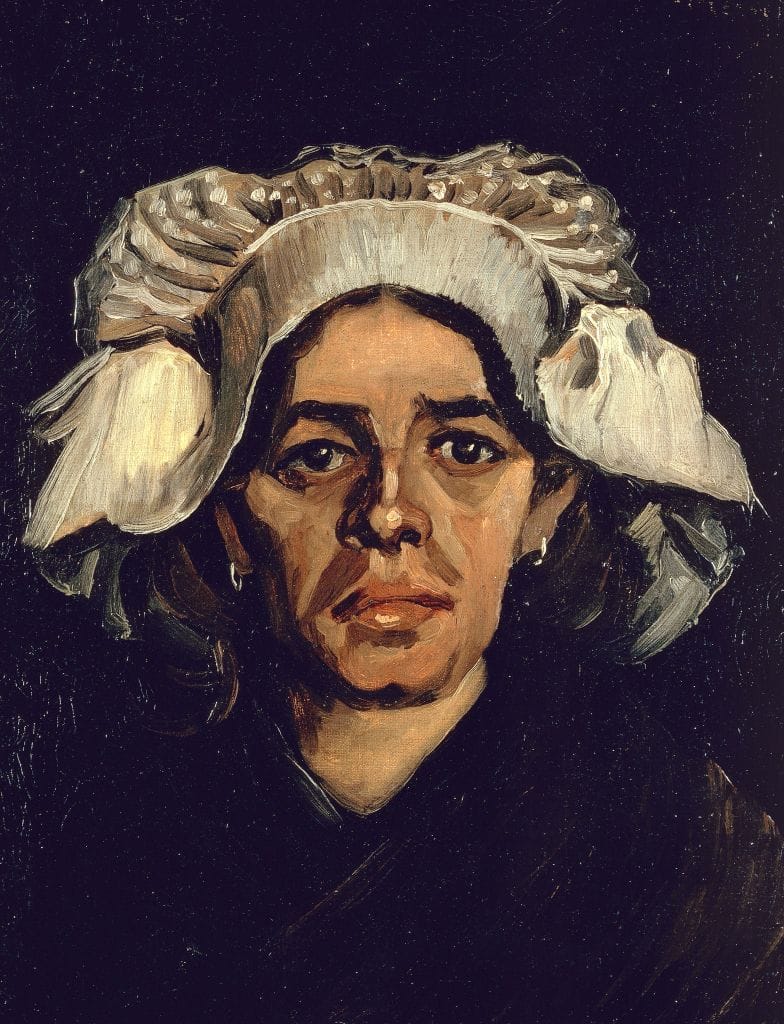 Nel periodo in cui dipinse 'teste del popolo', il pittore olandese aveva eseguito decine di dipinti di contadini e contadine senza nome nel villaggio di Nuenen, ma l'unico personaggio da lui nominato nelle lettere al fratello Theo è Gordina de Groot (1855-1927), che stava per compiere 30 anni. Gordina fu anche raffigurata nel primo capolavoro giovanile di Van Gogh, "I mangiatori di patate". I rapporti di Van Gogh con la donna provocarono scandalo nel villaggio: Gordina era infatti incinta e qualcuno arrivò a pensare che il figlio fosse dello stesso pittore. Il certificato di nascita del bambino non riporta il nome del padre. Chi era? Non fu possibile stabilirlo. Il pittore disse al fratello che si trattava di un cugino di Gordina. Probabilmente, però, la donna non era indifferente a Vincent. Nella descrizione del dipinto nel catalogo dell'asta di Christie's si legge che "sebbene Van Gogh abbia negato con veemenza queste affermazioni, la presente opera suggerisce comunque una particolare tenerezza tra l'artista e la modella, evidente nella forza del suo sguardo". "Testa di donna" è uno dei 40 dipinti che il pittore lasciò quando partì per Anversa nell'autunno del 1885. Furono tutti acquistati per un fiorino nel 1902 da un antiquario di Breda, per poi essere rivenduti un anno dopo a un commerciante di Rotterdam, Christiaan Oldenzeel. Da lui, il ritratto di Gordina fu acquistato nel 1903 da un banchiere dell'Aia, Henri Daniel Pierson. Da allora il dipinto era rimasto sempre nella collezione di famiglia. Oltre al ritratto che è stato venduto all'asta del febbraio 2023, si conoscono altri due ritratti di Gordina, uno conservato al Van Gogh Museum di Amsterdam e l'altro alla National Gallery of Scotland di Edimburgo: in entrambi i dipinti la donna è raffigurata con un berretto bianco.