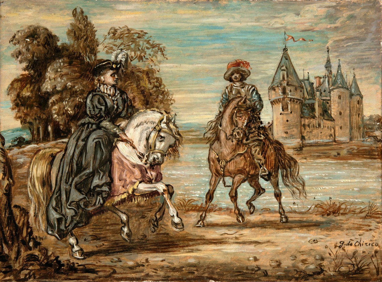 Uno degli aspetti più affascinanti della mostra è l'analisi delle varie fasi artistiche di De Chirico, con particolare attenzione al suo periodo barocco. Questa sezione contiene opere che ritraggono cavalli, cavalieri e castelli, elementi iconici che caratterizzano il suo linguaggio visivo. Il cavallo, in particolare, ricopre un ruolo centrale nella sua opera. De Chirico lo rappresenta in una varietà di pose, catturando il movimento e l'anatomia dell'animale con una maestria che testimonia il suo approfondito studio sulla forma e il dinamismo. Le sue rappresentazioni di cavalli non sono solo immagini statiche, ma raccontano storie di nobiltà e di epiche cavalcate, evocando un senso di grandezza e di mistero.