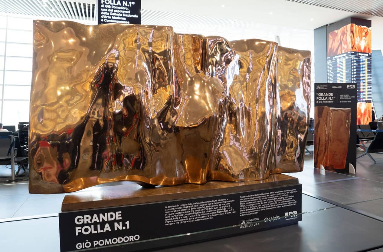 Una maestosa scultura in bronzo realizzata da Giò Pomodoro nel 1964 sarà esposta per un anno all’interno del Terminal 1 dell’Aeroporto di Fiumicino. Parte della collezione della Galleria Nazionale d’Arte Moderna e Contemporanea e restaurata grazie al sostegno di ADR, “Grande folla n.1” è caratterizzata da una superficie sinuosa e specchiante. Alta un metro e mezzo e lunga tre metri (per un peso di circa 500 chilogrammi), l’opera coglie tutta la vitalità che caratterizza l’aeroporto e ne esalta la dinamicità. Un’iniziativa che conferma la volontà di Aeroporti di Roma di trasformare l’esperienza di viaggio, elevando l’aeroporto da semplice punto di transito a luogo di cultura e bellezza. Una strategia che ha permesso al Leonardo da Vinci di vedere recentemente riconfermate le 5 Stelle Skytrax, massimo riconoscimento nel settore aeroportuale a livello mondiale, già ottenute nel 2022, e di essere annoverato, per la prima volta, nella Top Ten dei Migliori Aeroporti del Mondo, direttamente all’ottavo posto.