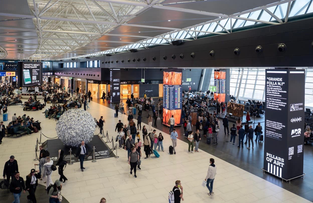 L’esposizione di “Grande folla n.1” è accompagnata nella piazza interna dell'aeroporto di Fiumicino da proiezioni multimediali che illustrano la collezione della GNAMC, che è la più importante al mondo di arte moderna e contemporanea italiana. Le immagini di una selezione di capolavori della Galleria corredati da un testo di presentazione vengono proiettate su grandi supporti led corrispondenti a 6 pilastri, Pilars of Art, che riscrivono lo spazio del Terminal 1, in dialogo con la scultura Grande Folla N.1 di Giò Pomodoro.