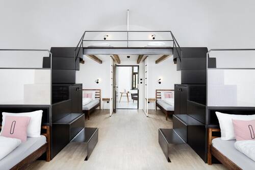 La ristrutturazione dell'edificio ha preservato la struttura interna, fatta di spazi ampi e luminosi, e sviluppato un sistema di pareti funzionali in cui sono inseriti letti, docce e servizi. Sono state create allegre stanze-dormitorio che evocano le cabine di una nave dove possono dormire fino a otto persone. Divertente l'uso della segnaletica che indica il bagno e i cassetti