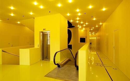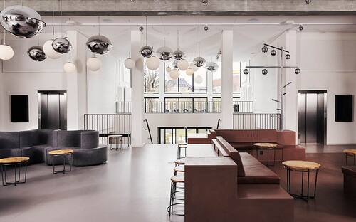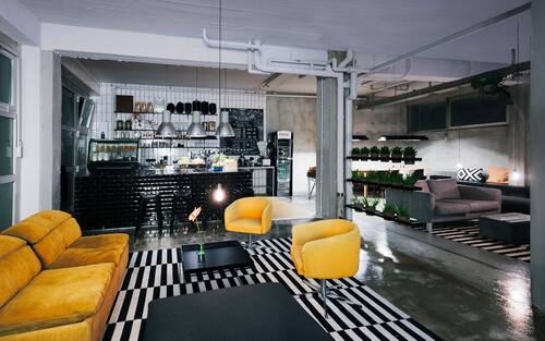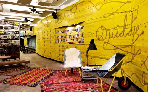 Restiamo in Germania ma ci spostiamo ad Amburgo per visitare il SUPERBUDE, ottenuto dalla ristrutturazione di una vecchia tipografia. Curati dallo studio di design Dreimeta, gli arredi sono all’insegna del riciclo. Una parete multifunzionale lunga quasi 50 metri, fatta di gialli pannelli per casseforme di cemento caratterizza l'area al piano terra