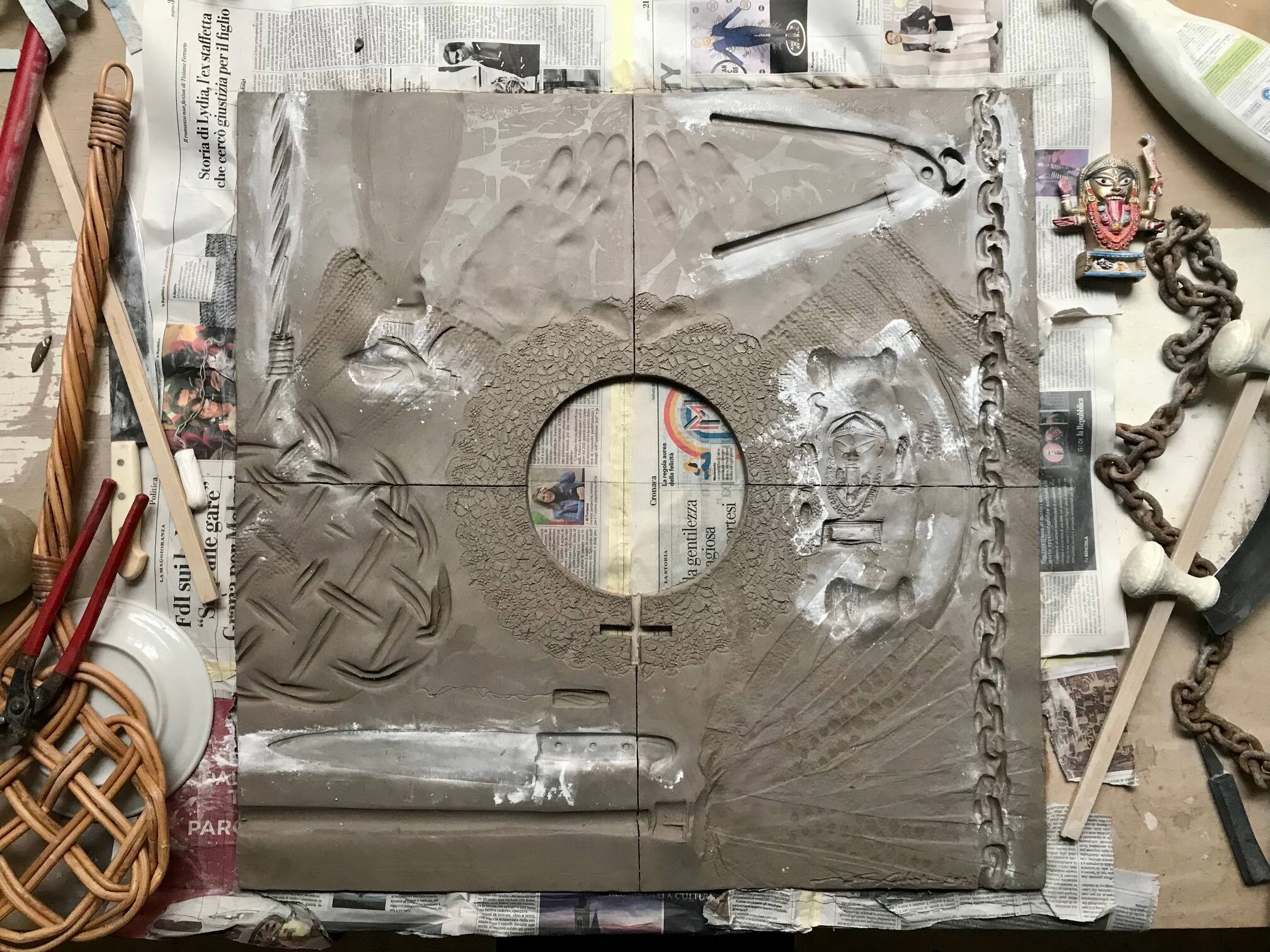 La scultura GODDESSINTHEDOORWAY è l’icona di questo universo: un totem ibrido, fatto di impronte, oggetti, frammenti di vita. Una divinità domestica e instabile, come un gioco di Jenga pronto a cadere e rinascere. Una guardiana che non concede protezioni facili, ma ricorda la nostra condizione di fragili viventi.