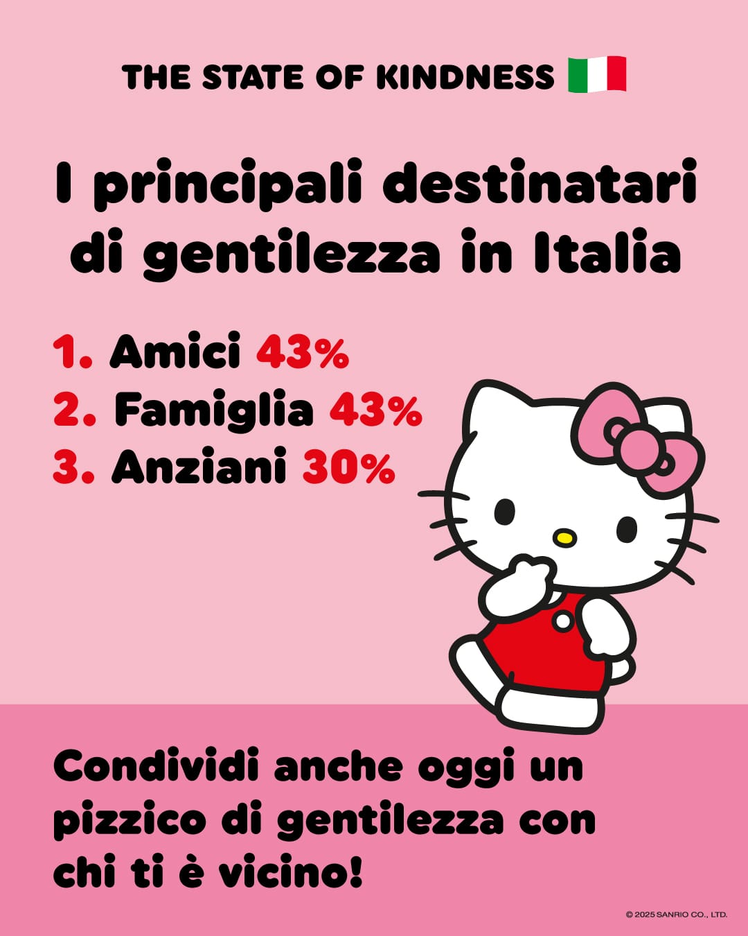 Gli italiani sono considerati da sempre un popolo particolarmente socievole, cordiale e ospitale, ma oggi potrebbero aver perso – almeno in parte – questo loro storico primato. È quanto rivela la nuova ricerca “The State of Kindness in Europe” realizzata da Sanrio – l’azienda giapponese creatrice di Hello Kitty – con l’Istituto YouGov in cinque Paesi europei – Italia, Francia, Germania, Regno Unito e Spagna – e pubblicata in occasione della Giornata Mondiale della Gentilezza. L’indagine, realizzata a ottobre 2025, ha esplorato la diffusione e l’impatto dei gesti gentili nella vita quotidiana e le emozioni che ne derivano, offrendo uno spaccato europeo ed italiano sullo stato dell’arte della gentilezza: la gentilezza è un’esperienza quasi quotidiana per il 71% dei cittadini europei (71% UE5 vs il 69% dell’Italia), che dichiarano di aver vissuto in prima persona atti di gentilezza nell’ultima settimana, attraverso piccoli e semplici gesti di grande importanza.