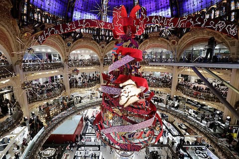 - Come ogni anno, all'interno delle Galeries Lafayette Paris Haussmann viene allestito un enorme albero di Natale. Decorato con oltre 8 chilometri di luci led e avvolto da nastri e tessuti scintillanti, l'albero parigino del 2025, è firmato dall’illustratrice Jeanne Detallante. Dedicato al tema “Il più bello dei regali”, l'albero si anima ogni mezz’ora creando un affascinante gioco di luci e musica.