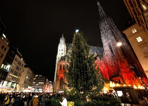 - Nella capitale austriaca, celebre per il suo mercatino natalizio sul Stephansplatz, è stato allestito - come da tradizione - un grande abete davanti alla cattedrale di Vienna. Circondato da bancarelle in legno, decorazioni tradizionali, l'albero illuminato trasforma il centro città in una "cartolina vivente natalizia".