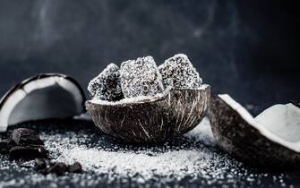 Palline di cocco e cacao. Mescolate la farina con il cacao e lo zucchero. Versate il latte e lavorate con le mani il composto. Ricavate 15 o 20 palline da riporre in un piatto pieno di scaglie di cocco. Giratele in modo che la superficie si ricopra interamente di bianco, poi lasciate in frigo a raffreddare fino a quando le palline non saranno compatte.