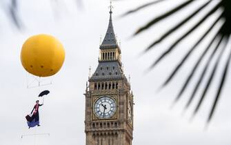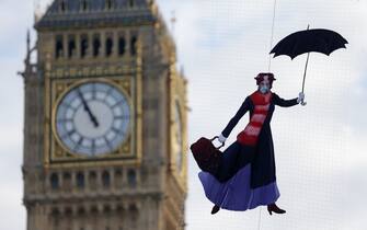 Mary Poppins in volo con la mascherina anti-smog davanti al Parlamento inglese. E’ l’ultima trovata di Greenpeace per sensibilizzare la politica britannica contro l’inquinamento dell’aria -