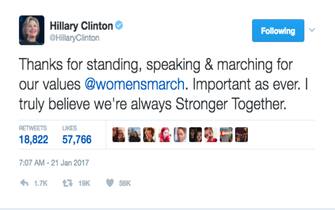 Hillary Clinton, su Twitter, ha espresso il suo sostegno alle donne che scendono in piazza a Washington e in tutti gli Stati Uniti. "Grazie per parlare e marciare per i nostri valori. È importante come sempre. Ritengo che siamo sempre più forti quando siamo insieme" ha scritto la Clinton, rifacendosi allo slogan della sua campagna elettorale, “Stronger Together”.