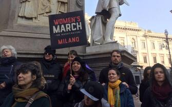 A Milano donne in protesta contro il nuovo presidente americano Donald Trump in piazza della Scala, di fronte a Palazzo Marino sede del Comune -