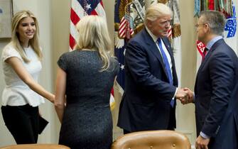 Ma Ivanka non è l'unico membro della famiglia del tycoon newyorkese a lavorare nello staff di Trump. Anche suo marito Jared Kushner (nella foto con Donald Trump e Ivanka, di spalle) lavora al servizio del Presidente come consigliere esperto -