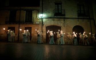 Nelle prime ore di lunedì 10 aprile a Zamora, nel nord della Spagna, si è tenuta la processione dei penitenti della confraternita del “Cristo della buona Morte”: uno delle tantissime celebrazioni che nel Paese accompagnano la settimana che precede la Pasqua. Nella foto, I membri della confraternita durante la processione -