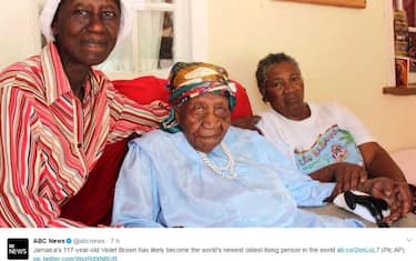 <blockquote class="twitter-tweet" data-lang="it"><p lang="en" dir="ltr">The world's oldest human is Jamaican Violet Brown, who was born on March 10, 1900. Congrats Violet. <a href="https://t.co/AnjXdHK1Kz">pic.twitter.com/AnjXdHK1Kz</a></p>— Andrew Holness (@AndrewHolnessJM) <a href="https://twitter.com/AndrewHolnessJM/status/853320738987757569">15 aprile 2017</a></blockquote> <script async src="//platform.twitter.com/widgets.js" charset="utf-8"></script>